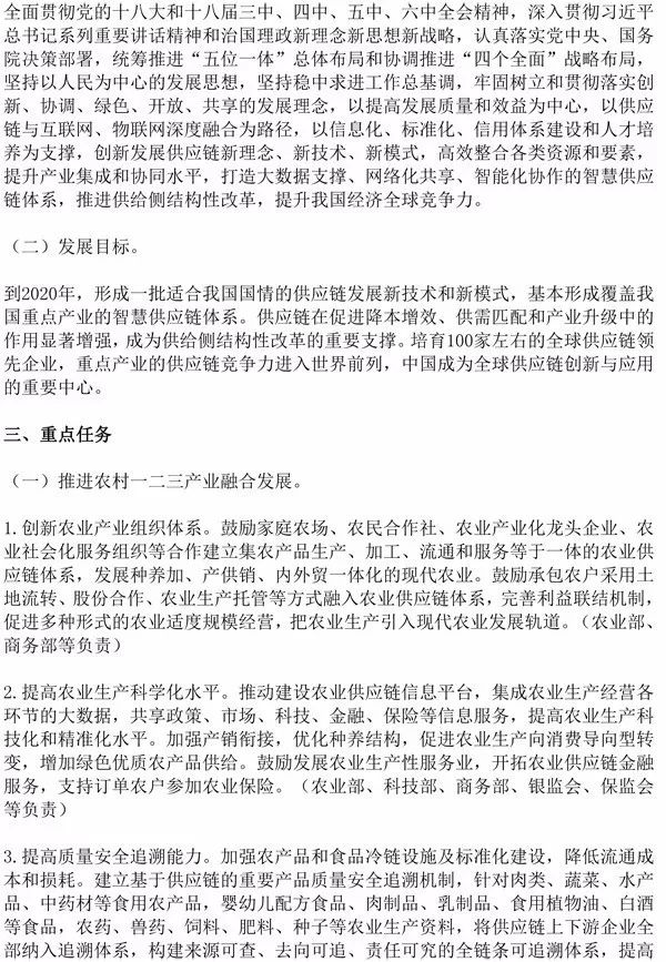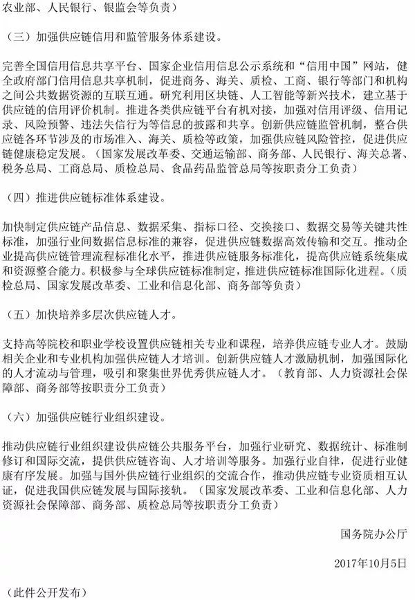 在這份文件中,提出了六大重點(diǎn)任務(wù)(覆蓋農(nóng)業(yè)、制造業(yè)、流通業(yè)、供應(yīng)鏈金融、綠色供應(yīng)鏈、全球供應(yīng)鏈六個(gè)方面)和六大保障措施(包括政策環(huán)境、試點(diǎn)示范、信用和監(jiān)管、標(biāo)準(zhǔn)體系、人才培養(yǎng)、行業(yè)組織六個(gè)方面)。
