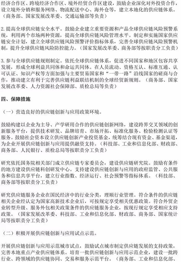 《意見》提出六大保障措施:一是營造良好的供應(yīng)鏈創(chuàng)新與應(yīng)用政策環(huán)境;二是積極開展供應(yīng)鏈創(chuàng)新與應(yīng)用試點(diǎn)示范;三是加強(qiáng)供應(yīng)鏈信用和監(jiān)管服務(wù)體系建設(shè);四是推進(jìn)供應(yīng)鏈標(biāo)準(zhǔn)體系建設(shè),五是加快培養(yǎng)多層次供應(yīng)鏈人才;六是加強(qiáng)供應(yīng)鏈行業(yè)組織建設(shè)。