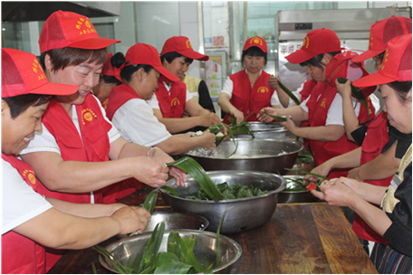 活動開始,工作人員提前準備好糯米、粽葉、棗等原材料,熱火朝天的忙碌起來,一會兒功夫,數百個可愛、鮮綠的“粽子”就呈現到大家眼前。很快,一個個結實飽滿的成品粽子就陸續加工完畢,裝袋待發。現場一片歡笑聲,洋溢著節日的氣氛。